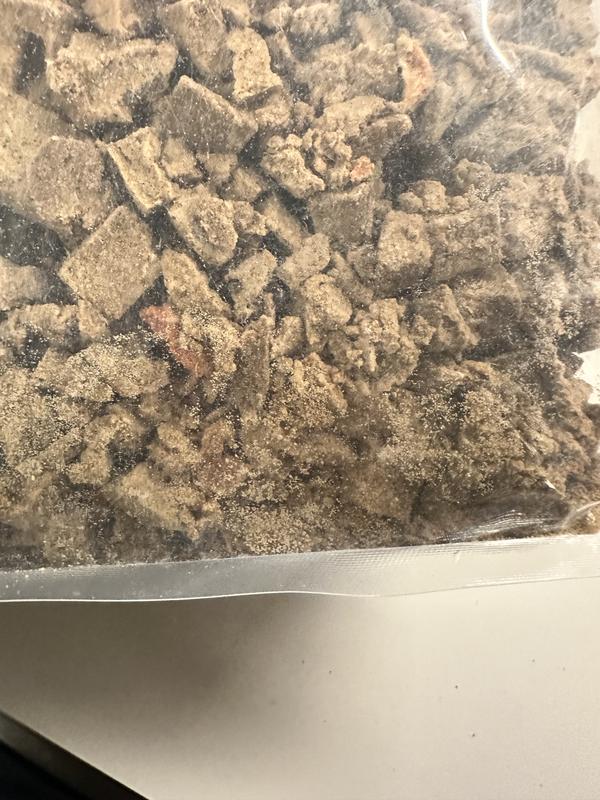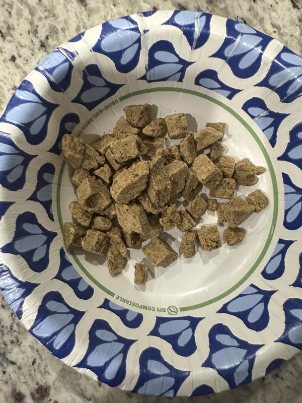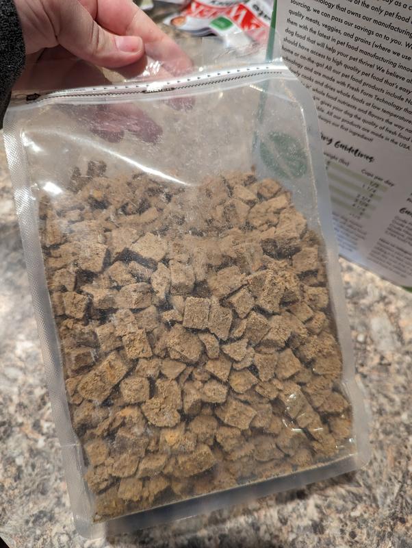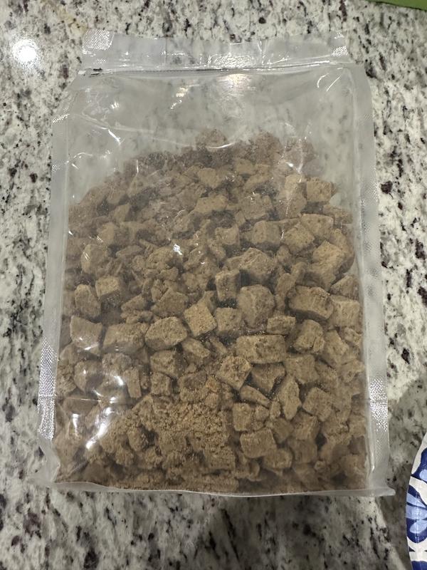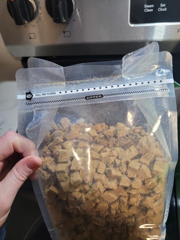Things we love: the resealable bag! I was definitely concerned how I was going to keep this product fresh, and was pleasantly surprised they had a resealable bag! Plus my pup didn't turn her nose up to this food at all. Things we're 🤷🏼♀️ about: while the pieces are a great size, a lot of pieces broke apart pretty easily. Might consider adding the 'dust' to water to create a slurry with the leftover pieces.