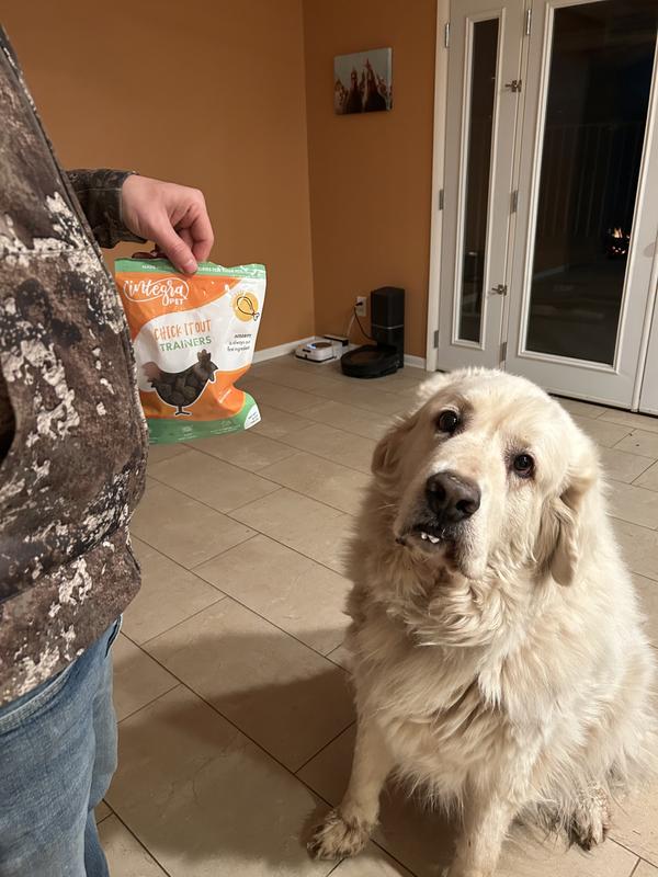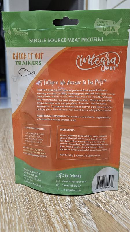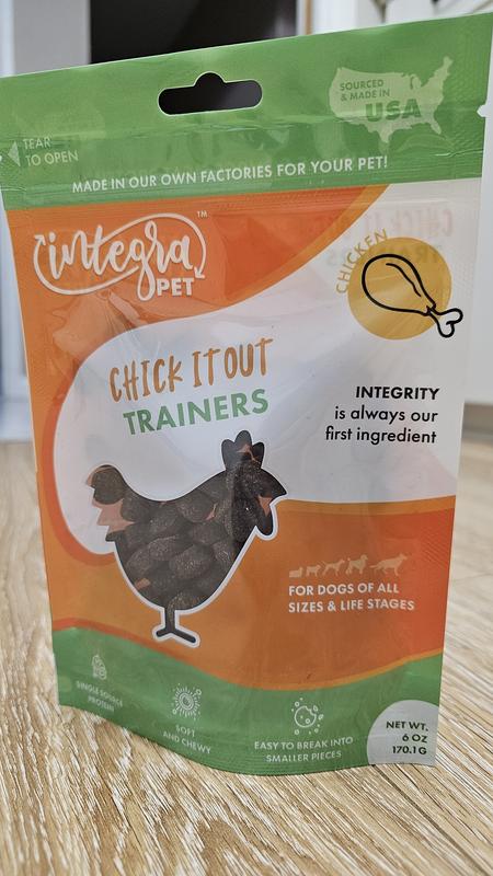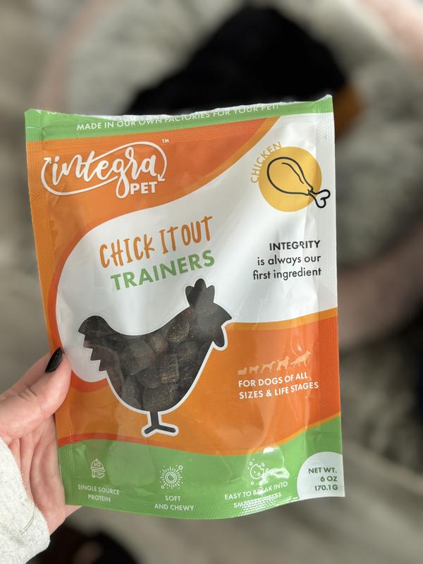 The Integra Pet Chick It Out Trainers are a perfect training treat. Their fist ingredient is chicken, and they are full of protein. They are small enough to give