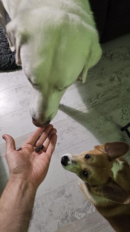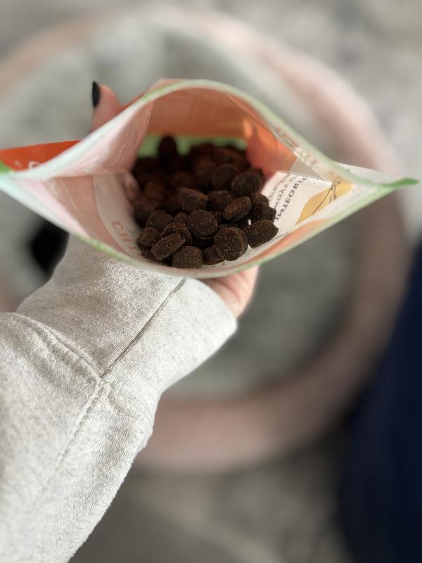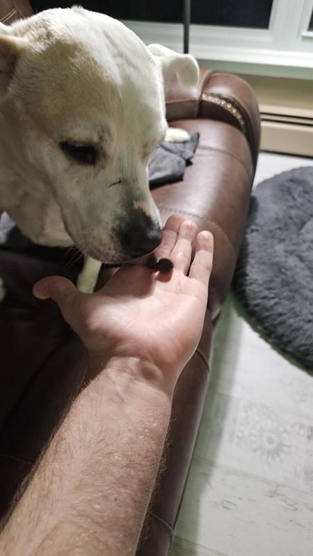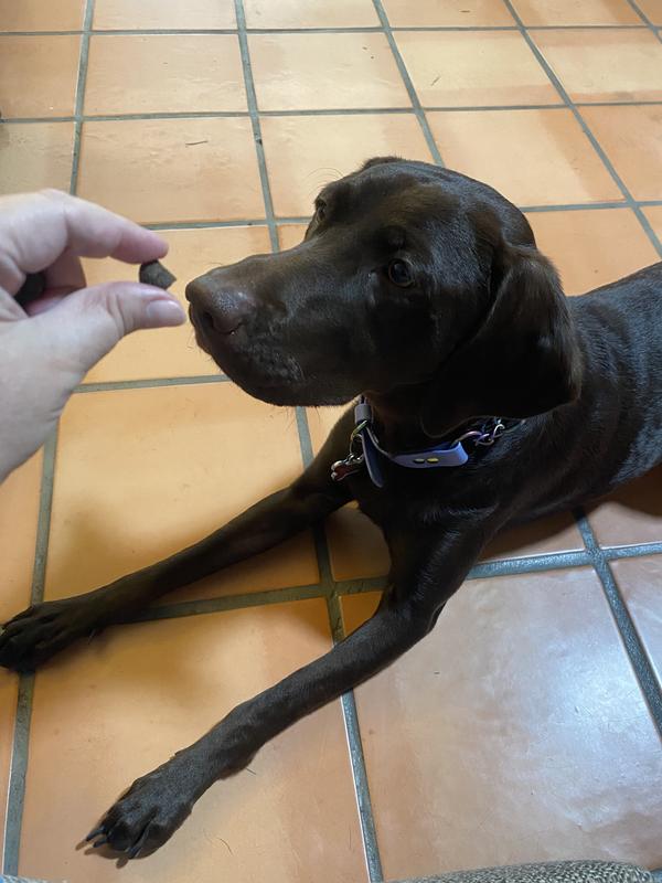Perfect sized training treats to include in toys (or for the frequent begger). They are a bit harder than I anticipated, but that made no difference to our three pups who quickly ate theirs up! Our one pup has a sensitive stomach, so we only fed her 2 to test the waters and she had no issues!