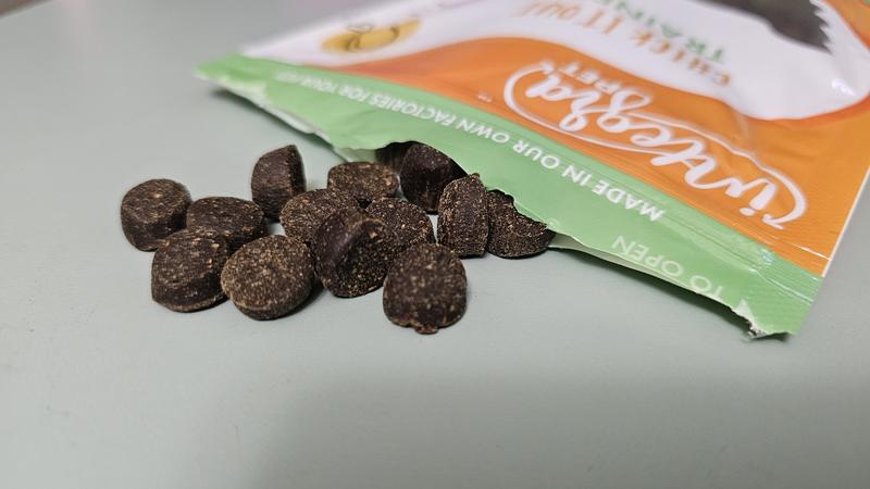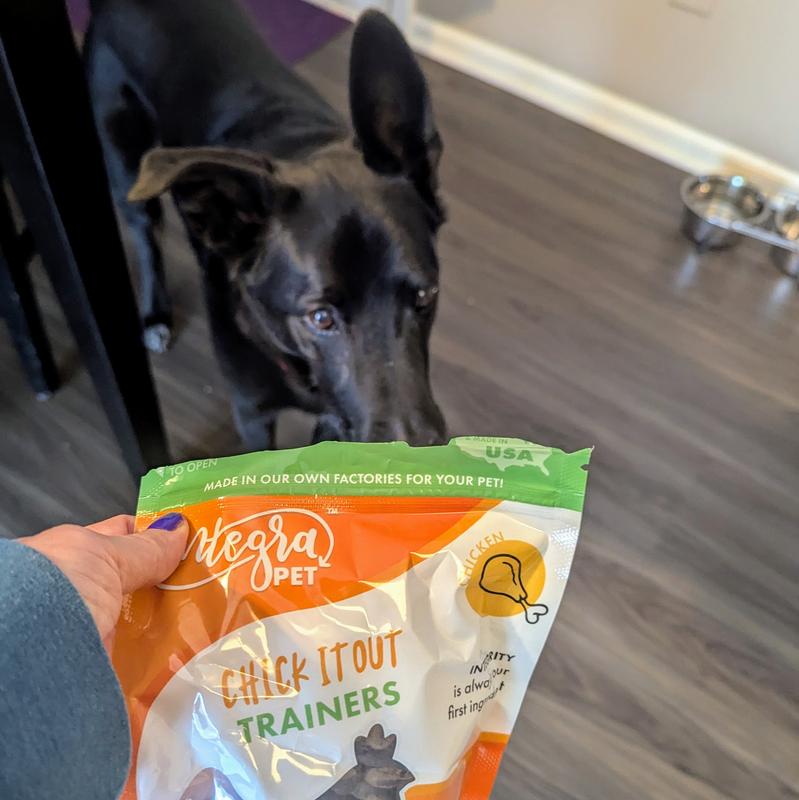The Integra Pet Chick It Out Trainers are a perfect training treat. Their fist ingredient is chicken, and they are full of protein. They are small enough to give each time your pet responds to a command. I am currently leash training my pup, Oscar. He gets one trainer treat each time we walk a stretch with out him pulling on the leash, and the positive reinforcement works great! I highly recommend!