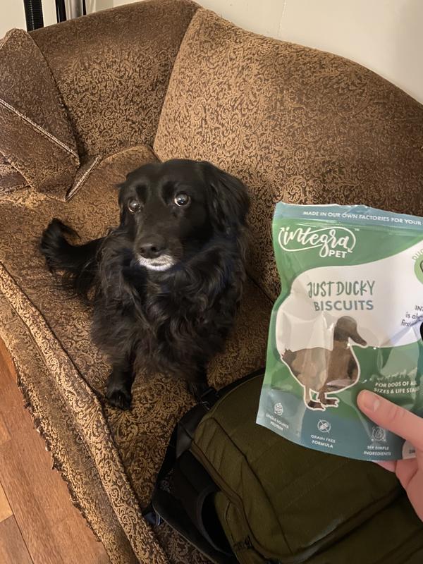 My Great Dane, Daisy loves the Integra pet just ducky biscuits. I like them because duck is the single source of protein, they are grain free and only have six simple ingredients in them. And I really like that they don’t cause her to have gas.
