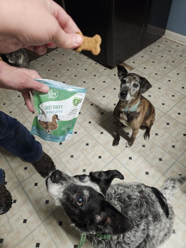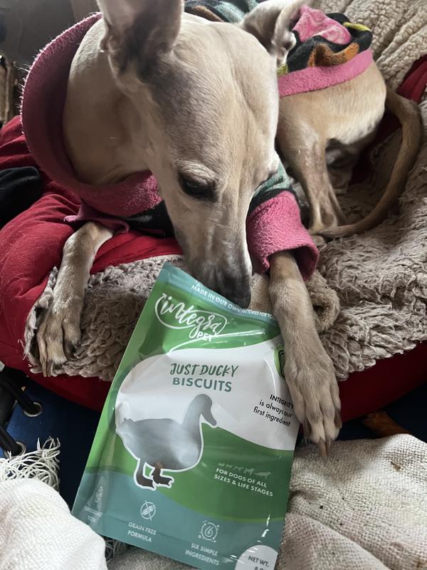 Whippets are very suspicious, even of new treats. "What if I don't like it?” “What if it has a pill in it?” “What if I have to learn a new trick to get it?” When I pulled out the Just Ducky Biscuits, they forgot all about that! Not one of them even hesitated. Every single one snapped it up and munched away as if they hadn’t eaten in a week! I use them for special treats and have to keep the bag on top of the refrigerator. The kitchen counter isn’t high enough to discourage thievery! Will definitely buy these again.