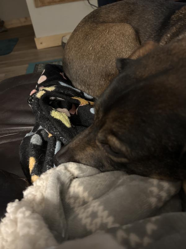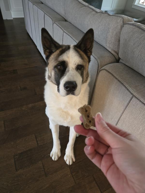 We have 1 dog and 2 fosters at the moment, this treat was a big hit with all three. Maple who is ours is a mix of Alaskan malamute and who knows what, she is 3.5 years old. Brie (foster) is some type of hound and we figure 1-2 years old. Buddy (foster) we have no clue what kind of breed he is and we figure he is about 1-2 years old. I liked how this treat stayed together and did not crumble like a cookie may.