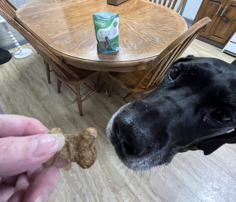 My Great Dane, Daisy loves the Integra pet just ducky biscuits. I like them because duck is the single source of protein, they are grain free and only have six simple