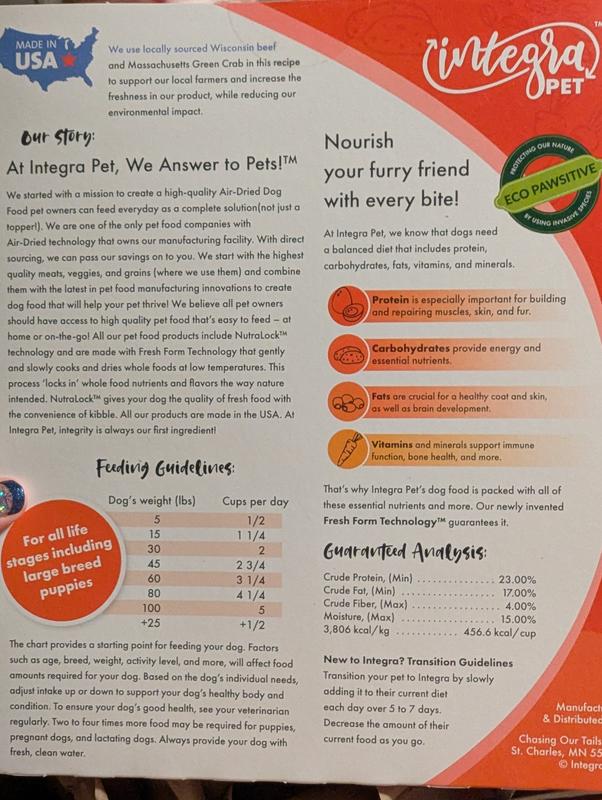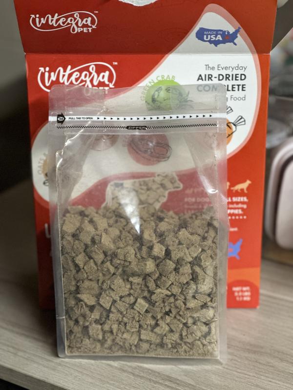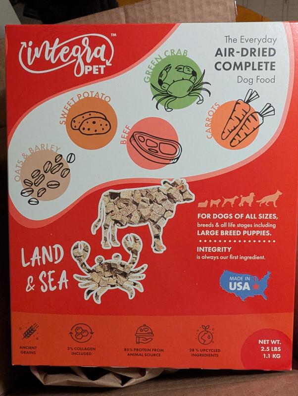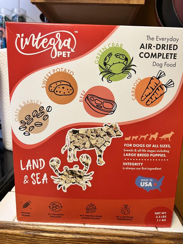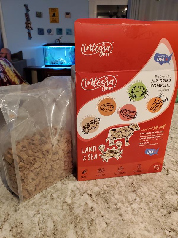 My 3 Norwich Terriers absolutely love the Land and Sea (locally sourced Wisconsin beef and Massachusetts Green Crab) flavor of this Integra Pet air-dried complete dog food. It is the perfect size bites for their small mouths.... not too large or too small. I appreciate the fact that the source of all ingredients used in the product is from sources that are human edible and all meat sources originate from USDA inspected facilities.