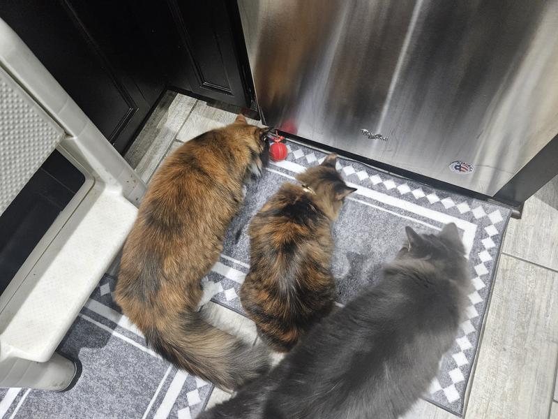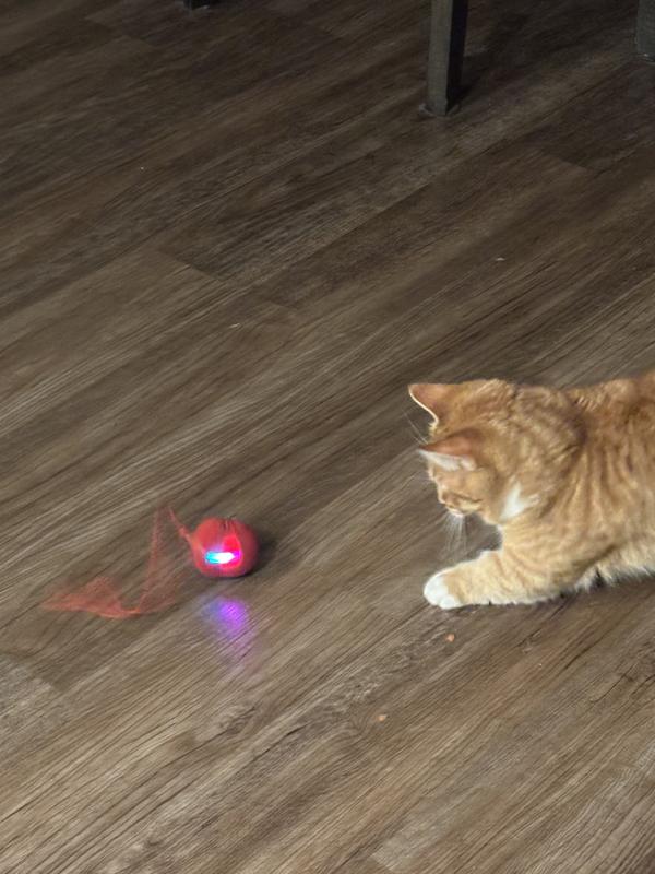 I have three cats with very different personalities. One is more sluggish and lazy and usually does not care for toys at all. Another one is extremely playful and obsessed with toys and she is my girl cat. My third male cat is very skittish and easily scared. This toy surprisingly grabbed all three of their attention. My skittish boy Theo and my girl Baby Girl were chasing this toy all around the house. I really loved that I did not have to worry about it getting stuck under furniture because it actually finds its way out on its own. I also love that it is rechargeable. I really dislike changing batteries and wasting them, especially for cat toys, so the rechargeable feature is a huge plus for me. The toy has two settings and my cats loved both. The first setting allows it to roll all around the house, which had them chasing it everywhere. When it rolled under the couch, they were still very intrigued. It also makes a soft bird chirping sound, but it is not loud or annoying like many other cat toys. The sound is smoother and quieter, which actually kept their attention longer. If you do not want it rolling all around your house, you can place it inside a box and it will still give the same fun effect. The second setting is more stationary. It moves a little but not nearly as much as the first option, which is great if you want a calmer play mode. This toy is clearly great quality and does not feel flimsy or cheap. If you are going to invest in a toy that moves around and keeps your cats engaged, I would one hundred percent recommend this one. All of my cats were very happy with it, and as you can see in the pictures, my girl Baby Girl was begging me to put the toy down because she was so excited to play.