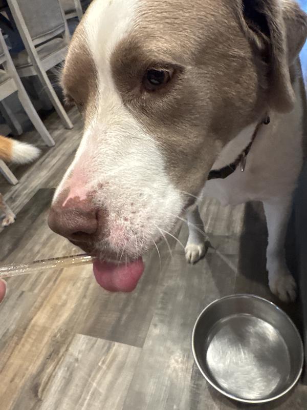 My senior dog is using this product now just to keep him healthy. It’s hard to say if any vitamin or product is actually working to keep a dog healthier but just like I take vitamins for prevention, I try to give my dogs supplements or vitamins that will give them a longer or more comfortable life. The liquid is supposed to be chicken flavored and my dog seems to like it. He will lick it off a dry bowl or eat it in his food.
