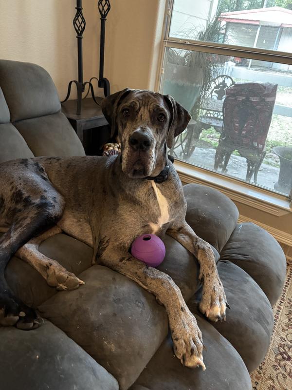 Duke is our 100 pound lab that can destroy everything; he’s ripped the tops off of black 2XL kongs before! These balls have been amazing for him. He chews on them