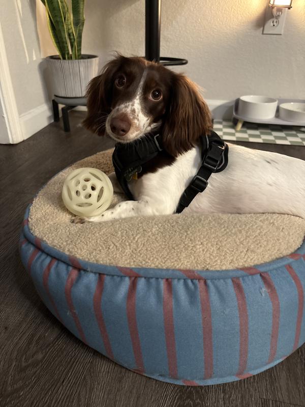 We have a small dog and she actively plays all over the house with her round toys. The medium and larger size one are more challenging and we can also put a reward treat in them. These are made well, washable and glow in the dark. They actually stay lit through the night. She takes the large one to bed!