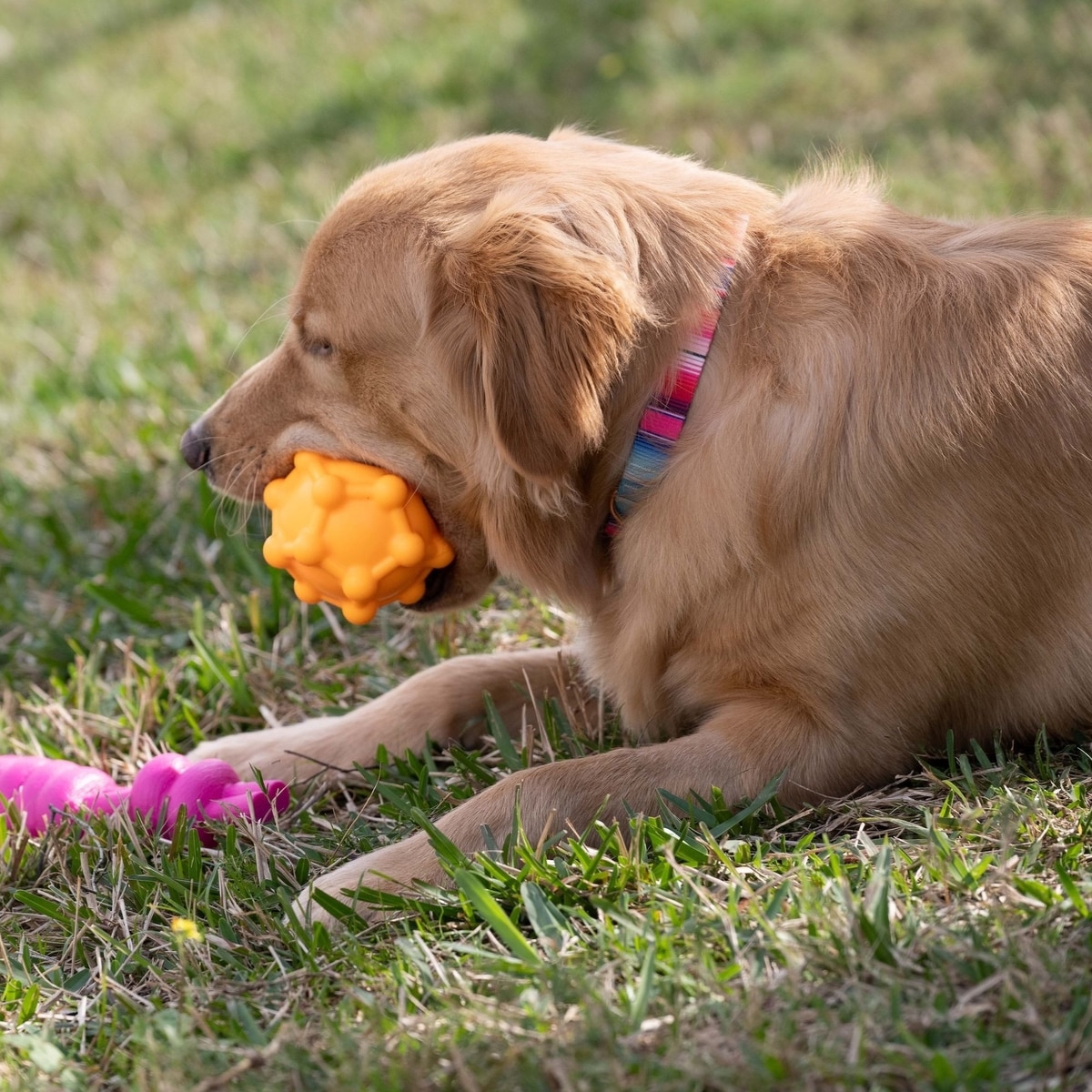 • This toy is lightweight and easy to toss, bounce, and carry, making it great for both fetch and solo play.