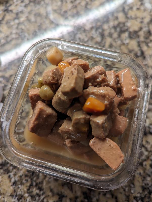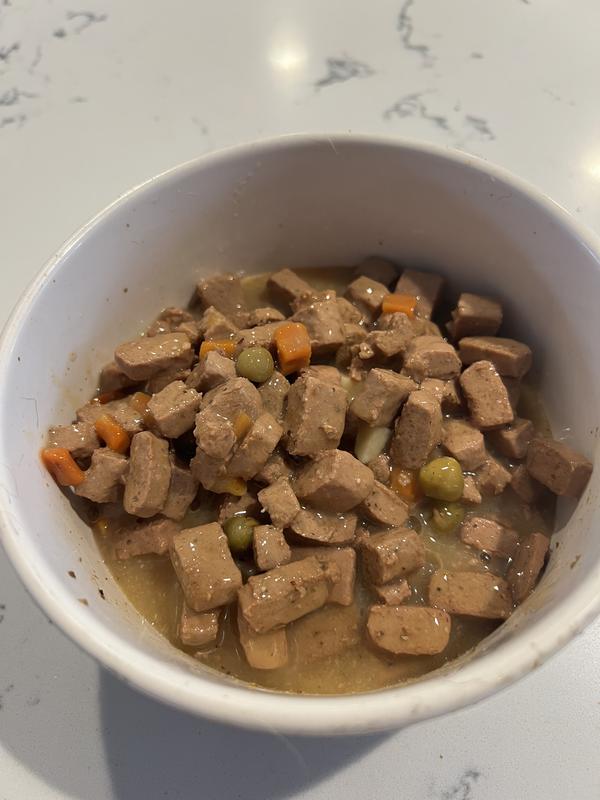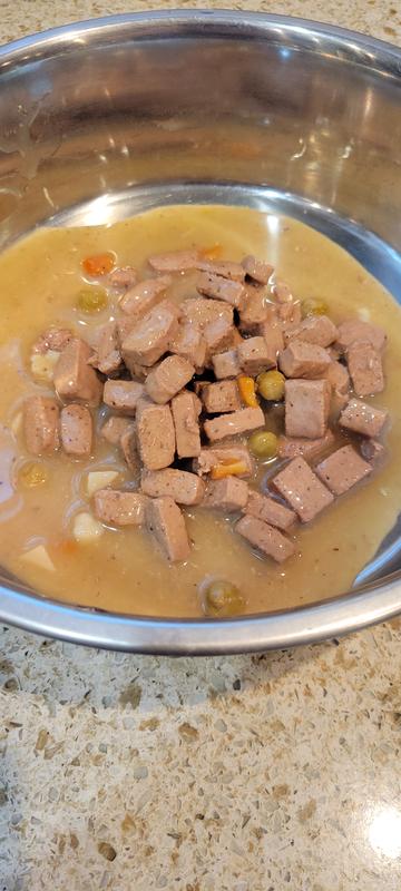 I use the food as a “topper/add in” to the dogs dry kibble. The gravy is a great coating on the kibble and the size of chunks mixes in well. They enjoyed it and