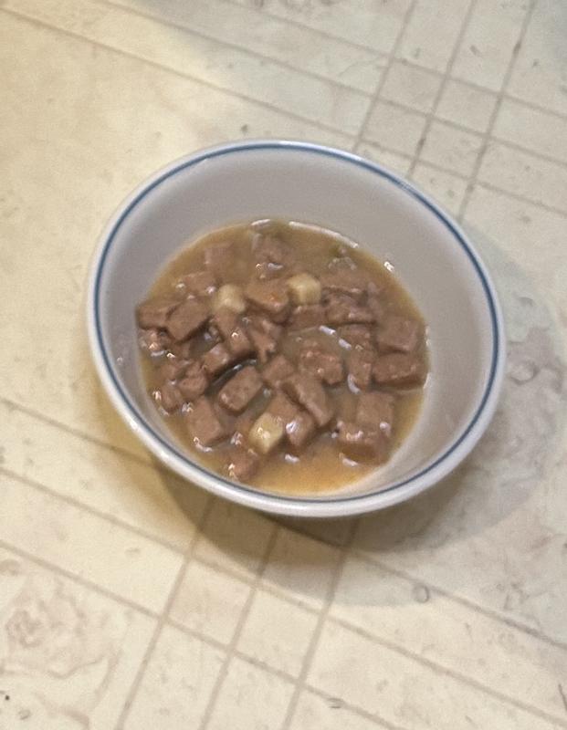 I use the food as a “topper/add in” to the dogs dry kibble. The gravy is a great coating on the kibble and the size of chunks mixes in well. They enjoyed it and lick their bowls clean.