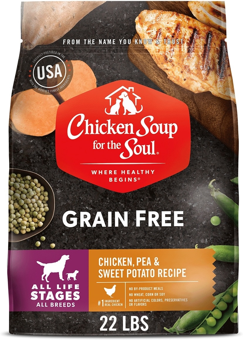 - Chicken Soup for the Soul Grain-Free Salmon, Pea & Sweet Potato Recipe Dry Dog Food, 10-lb bag$28.99 Chewy Price$29.99 List Price$27.54 Autoship PricePromo, Spend $100, Get $30 eGift Card with code NEWYEAR +1 deal