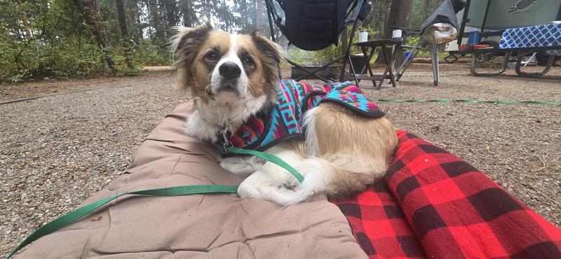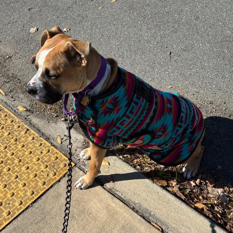 Warm, beautiful colors and easy to put on. My pup, Finnick, seems comfortable camping in the coat!