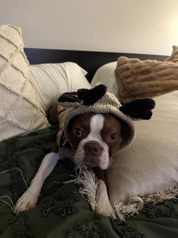 The first one was way too big for Coco. We contacted you and you sent a smaller one and she loves it. Looks sweet wearing her moose hoodie.