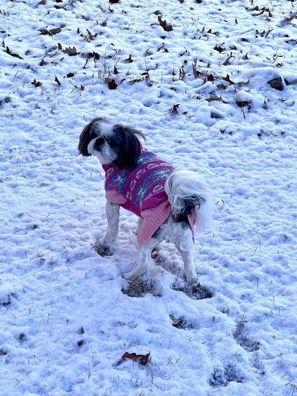 This beautiful sweater fits my Zoey perfectly and keeps her warm during winter months. The material is high quality and the colors are vibrant. Very happy with my