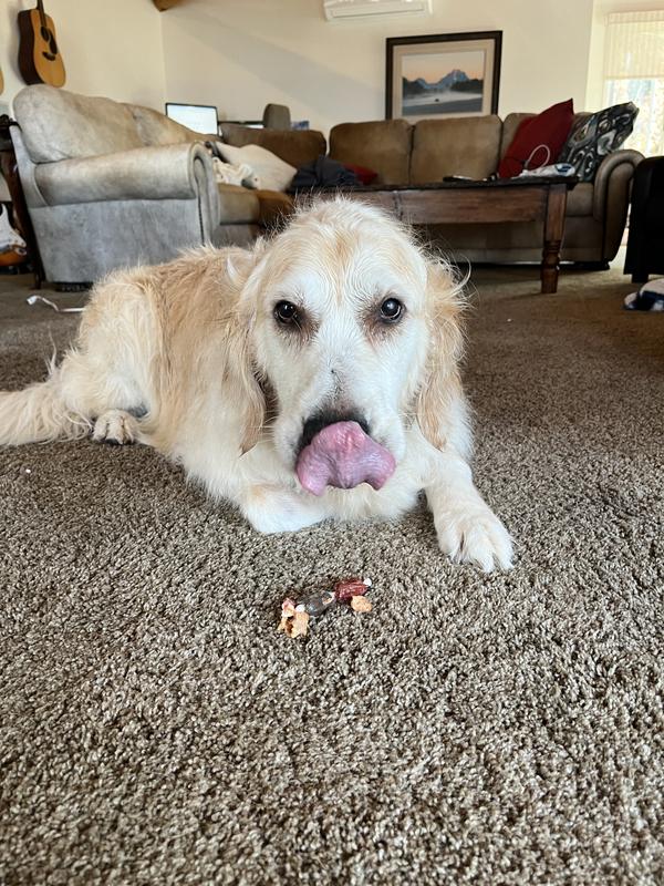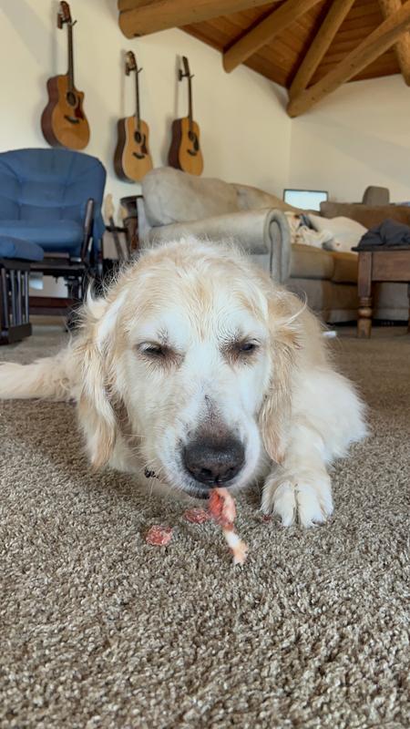 Our pup absolutely loves these bones. There are three different flavors of meat wrapped around the bone itself. The first time we gave one to our girl, she spent