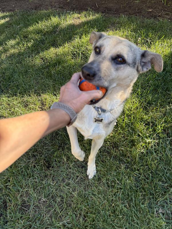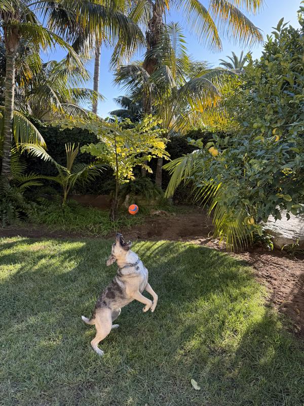 These balls are super bouncy and easy to clean! I like that they come in different sizes. These are the large size my dog Penny is playing with. She is a 5 y.o. 45 lb. cattle dog/bulldog mix who loves to fetch. A size smaller would be appropriate for her also as this size would be a good fit for a much larger dog as well. We have a lot of sand and dirt in our yard and I know several dogs who have worn down their canine teeth because they fetched felt-covered balls that held the dirt and ground away the enamel on them, and maybe ground beyond the enamel in some cases. With these Chuck-It balls, most of the dirt falls off or is easily rubbed off or rinsed off, depending on how damp they get. This can be very important for dogs who have already worn some teeth down from fetching felt-covered balls. The Max Glow ball is exceptionally fun! It bounces exceptionally well and easily and has more “give” or “squishability” for dogs who love that. And of course, you and your dog can see it remarkably well after the sun goes down! We have lousy outdoor lighting and this is an awesome feature! (But it is difficult to photograph because the flash tends to go.) The holes on either end of this one are large enough for most forefingers to access and wipe out inside if a bit of that is needed in addition to rinsing. Both are very durable and handle outdoor conditions and sun exposure well. Easy to see and find compared to some other balls. Great high-quality products and well-loved!