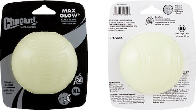 Chuckit balls are the best and this glow in the dark ball extends winter play time into the late evening when it’s too dark to see a regular ball. My leash has a flashlight on it and after a few seconds of lighting up the ball it glows intensely for our entire play session!