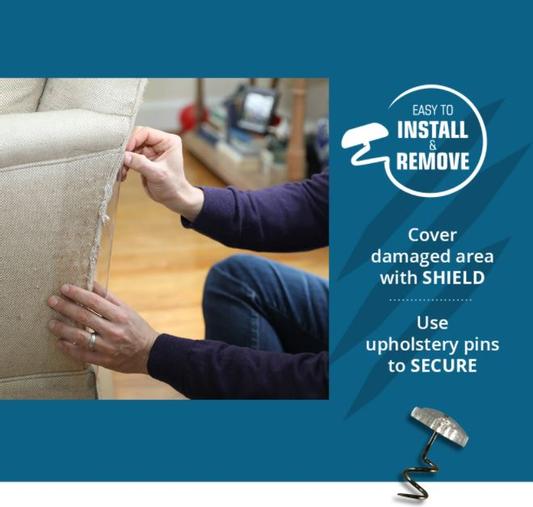To attach the pins to your upholstery, simply twist pins to firmly lock the protective barrier in place. Easily twist the pin to lock securely into fabric and counter twist to remove. No damage to furniture and no sticky residue. Please refer to the pictures below for reference.