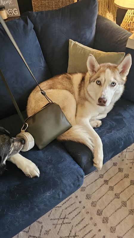 Really like this portable yet roomy, water resistant, double space treat pouch! I can keep dry treats or a small meal for my dog on one side and moist/chewy treats on the other side. I keep mini carrots for him in there too. Freeze dried raw on the other at times too ☺️ Really cute and very well made. Easy to wipe clean too.