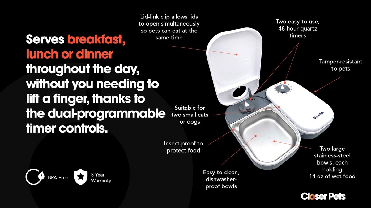 Closer Pets Two-meal Automatic Cat & Dog Feeder, White
