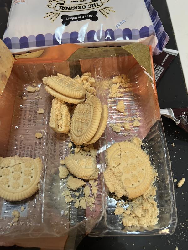 The cookies came open and crushed I don’t know why they would put it under the bag of dog food.