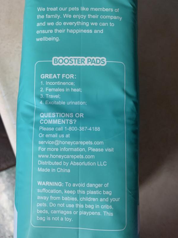 - The large adhesive tag on the back sheet makes it easy to attach the booster pad to washable male wraps or female diapers.