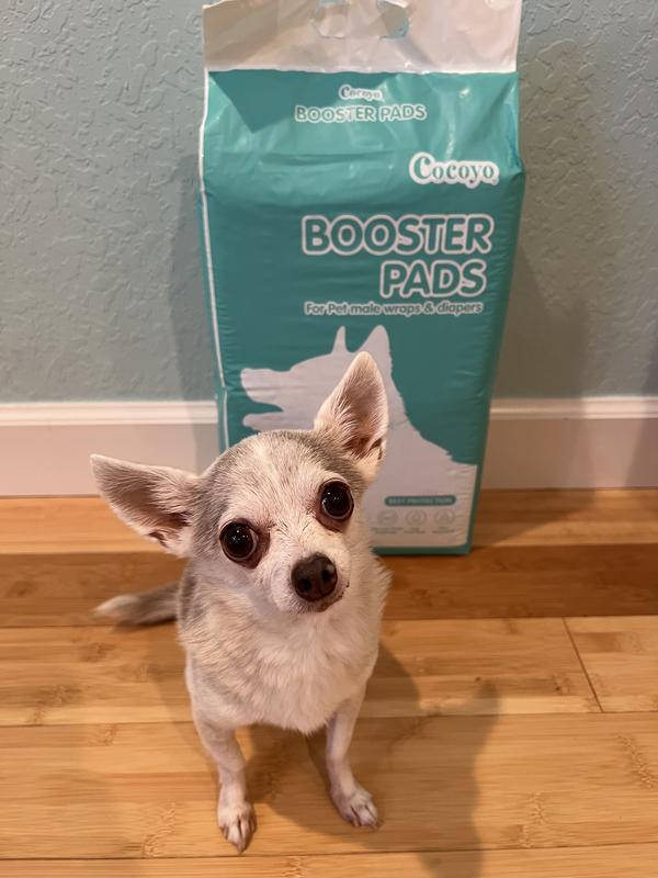 I have 2 male Norwich Terriers (3 years old and 14 years old) who wear belly bands. Their 3 belly band brands are sized small, medium and large however they all appear to be the same width and length. My dogs are roughly 10 pounds. I tried the xs/s booster pads and they fit perfectly. The adhesive fit them securely in place. I have pictured a regular women's sanitary pad for reference. My dogs do not urinate in them heavily. The oldest dribbles a little and the youngest wears them so no hiking the leg indoors.