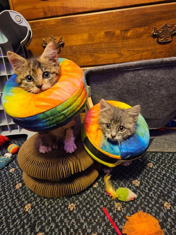 I bought this for my 2 kittens who had to have surgery, they both were only 1.6lbs and 8 weeks old! This I product was a 10 out of a 10! They never got it off once, and it was SO much better and more comfortable for them than the old plastic E-collars!