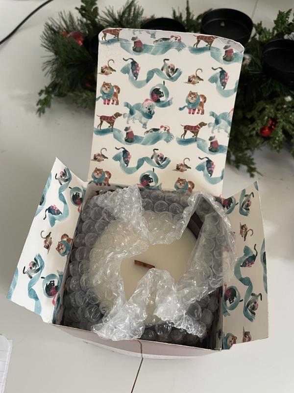 Stunning candle with beautiful scent! I added this candle to our Christmas table scape and each and every one of my kids stopped in the dining room to ask what smelled so good! It smells like Christmas, comes in lovely packaging & I love the wood wick!