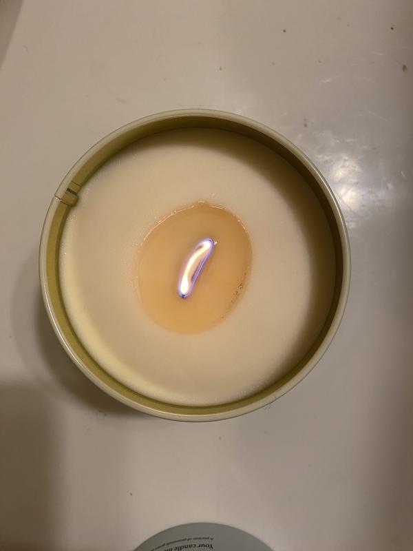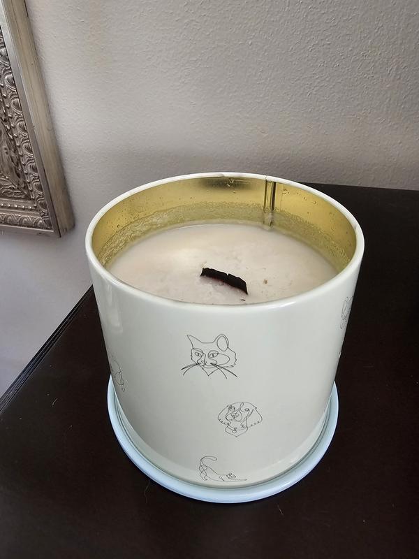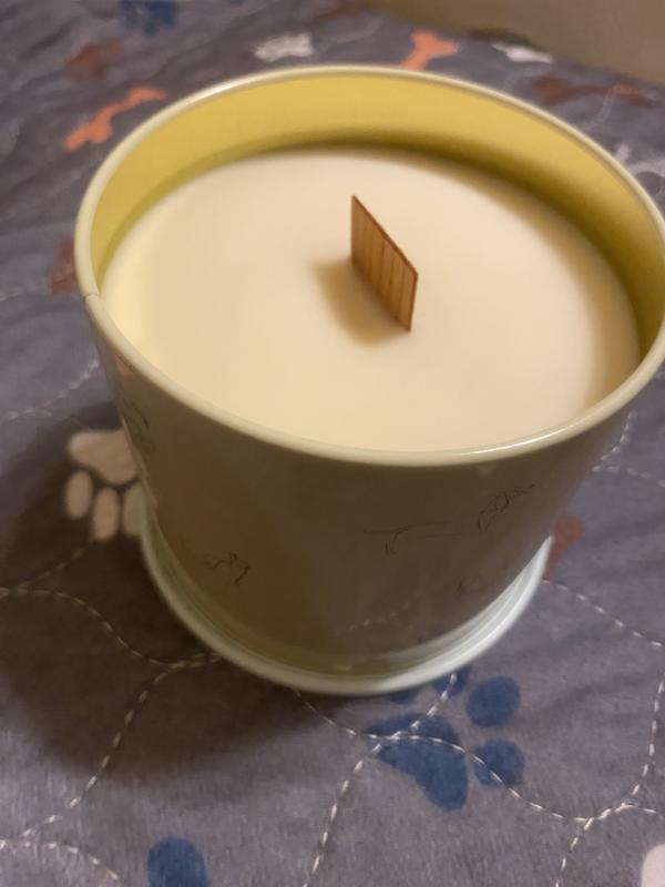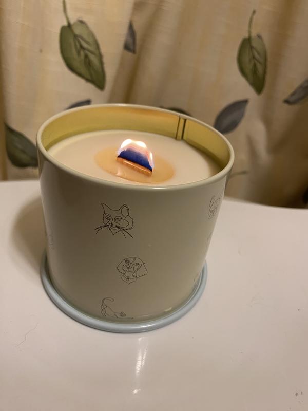 Love everything about this candle: the scent, the container, even the unusual wick. It smells like real vanilla (not like chemicals). The smell is delicate enough to be pleasant but robust enough to fill the room in a brief period of time. The pastel blue metal container it comes in (no glass jar) is decorated with lovely dog and cat designs. The lid covers the entire container, so it’ll make a good storage container once the candle is used up. It’s also wide and stable, difficult to knock over accidentally. The wick is unusual, at least for me. It’s a wide piece of cardboard. Took a bit longer to light up than a string wick but not by much. I thought it helped to melt the wax more evenly. I would buy this product.