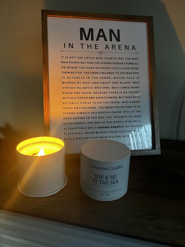 The You & Me By the Sea companion candle is lovely. The candle is in a metal container with a large lid that stays in place when not in use. The wood wick is easily lit. The candle smells amazing - nice sea salt aroma with well balanced neroli notes. Very fresh and clean aromas.