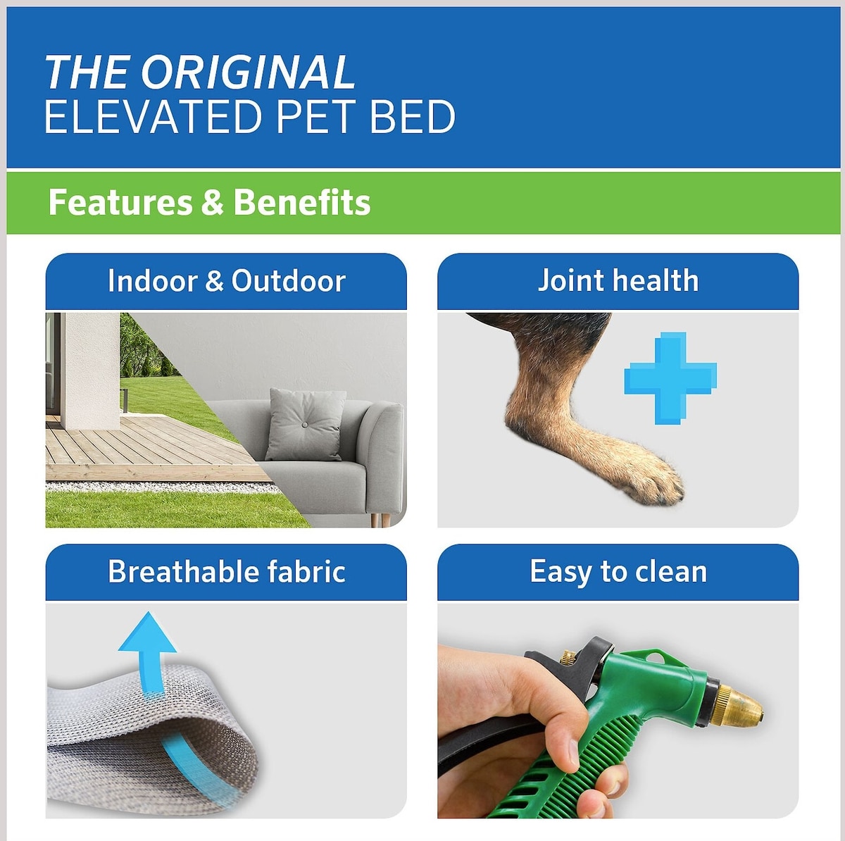 The main benefit of this elevated bed is that it allows air flow on all sides of the bed, keeping your pet cool and comfortable. Another benefit is that it's made with a metal frame which tends to be very durable, even with a pet who tends to chew.
