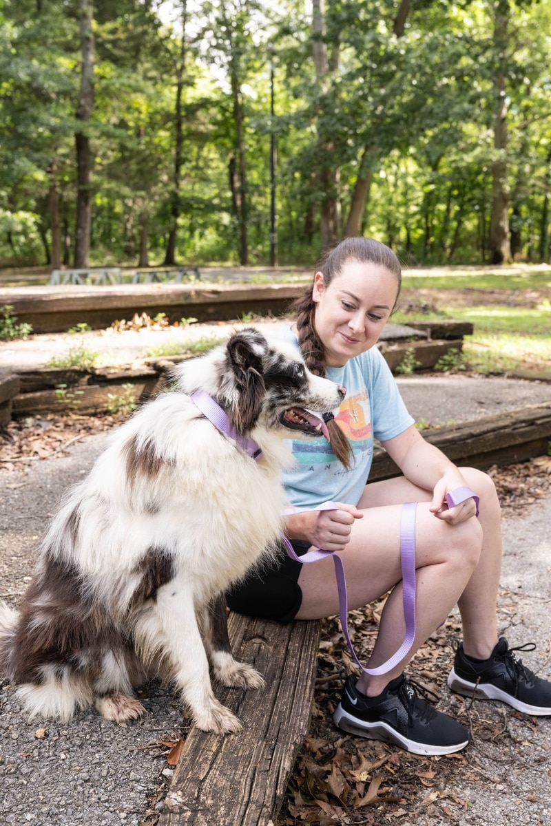 Thick and sturdy material while still being flexible and comfortable for my pup. The clip is large so it’s easy to clip on her leash, I can usually clip it with