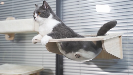 The suction cups can be attached to glass, while the nails can be driven into the wall to support the cat tower and space capsule.