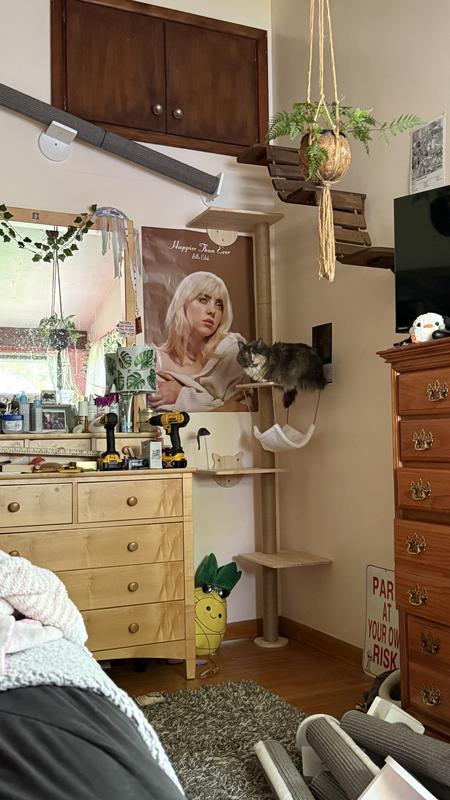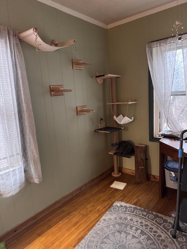 I had high hopes for this wall tree, it fits my space perfectly but I had issues installing it. The screw holes did not line up so I had to have a man with tools drill new holes. The hammock is very flimsy and small so I didn’t bother with it. My cat Teddy is happy with it but I wouldn’t recommend it for the price considering the issues I had.