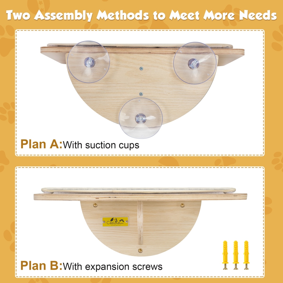 Two different installation methods allow you to choose the one that’s right for your home. Install the cat perch on your windowsill using the strong hook-and-loop fasteners underneath if you want to avoid drilling any holes. Or, for greater stability and safety, you can also install this platform using the included expansion screws.