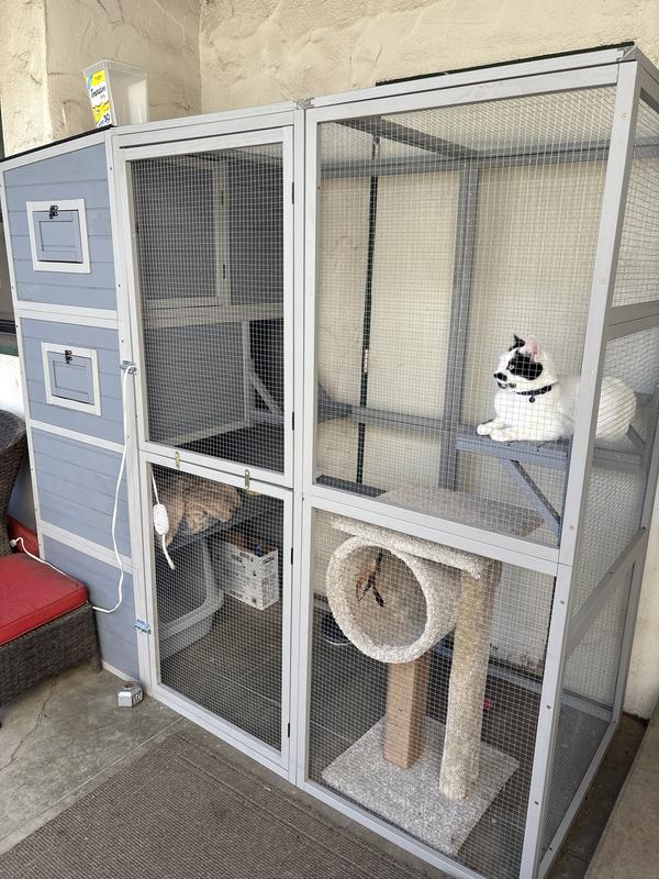 Nelly liked but I don't the material is ship very week it needs work the roof should be cover for one end to the other my cat does not look up to the sky the small doors needed scrins for the cat not to run out the lucks ships not strong bend over easily the side is perfect it should come with a cover when is raining for the cat litter not to get wet it needs a platform too.