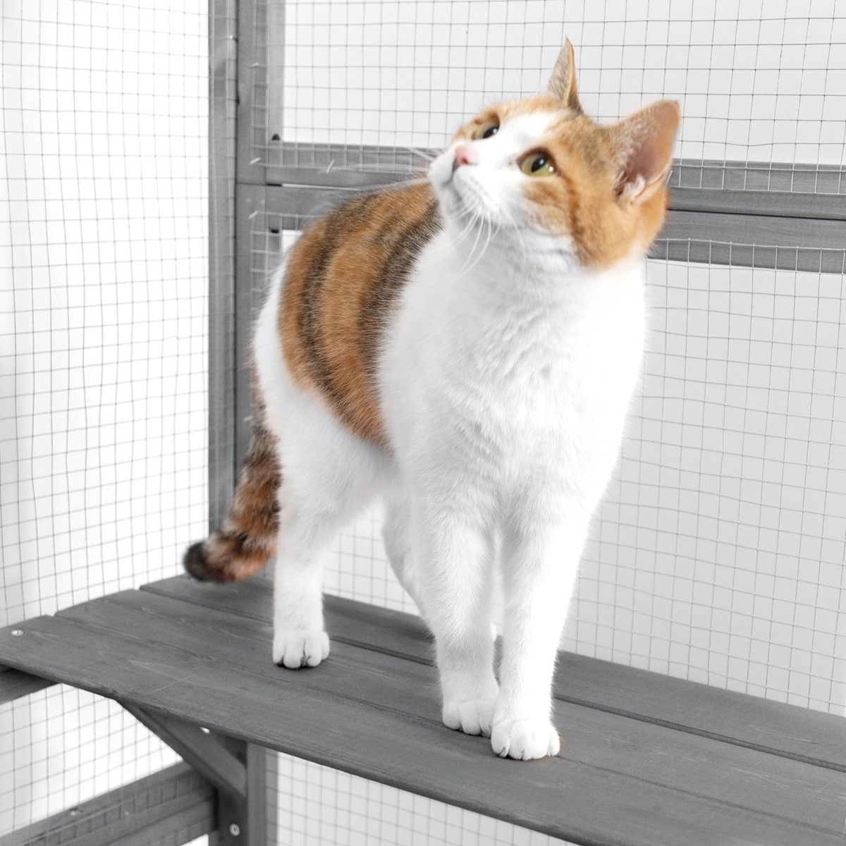 Don’t buy it. I have three cats and have only used this as a recovery area for one cat. The smallest of the three. She had surgery and I used this for her outside time. The top box’s floor fell through. Riddle me that one Batman. Then the little shelves started to break under the weight of this little cat. The smallest shelf the middle wood piece came out. This is trash. Don’t waste your money like I did.