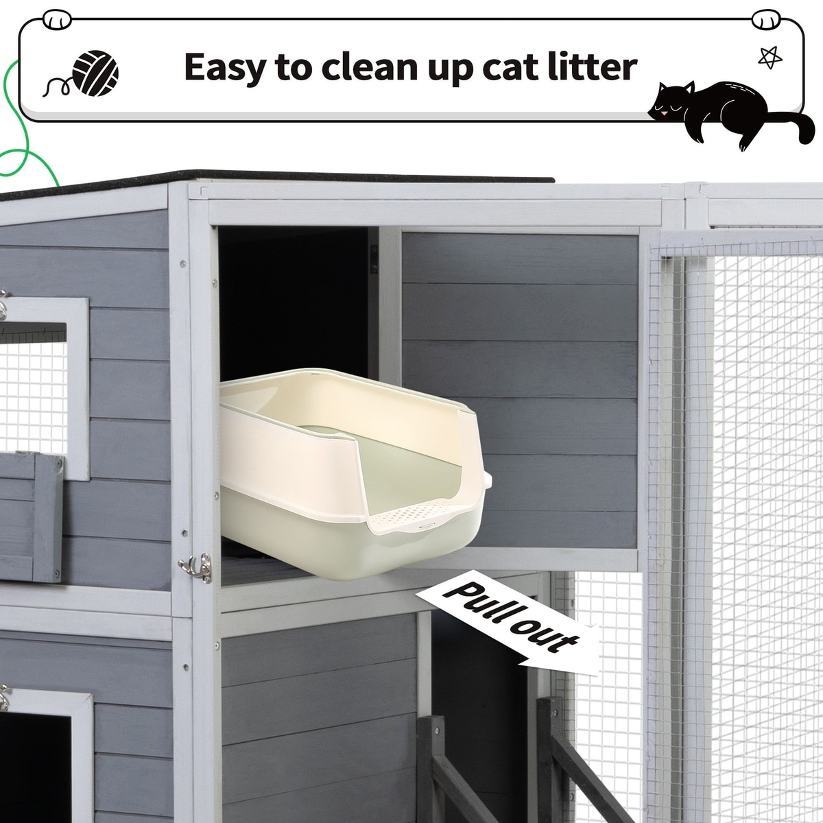 Nelly liked but I don't the material is ship very week it needs work the roof should be cover for one end to the other my cat does not look up to the sky the small doors needed scrins for the cat not to run out the lucks ships not strong bend over easily the side is perfect it should come with a cover when is raining for the cat litter not to get wet it needs a platform too.