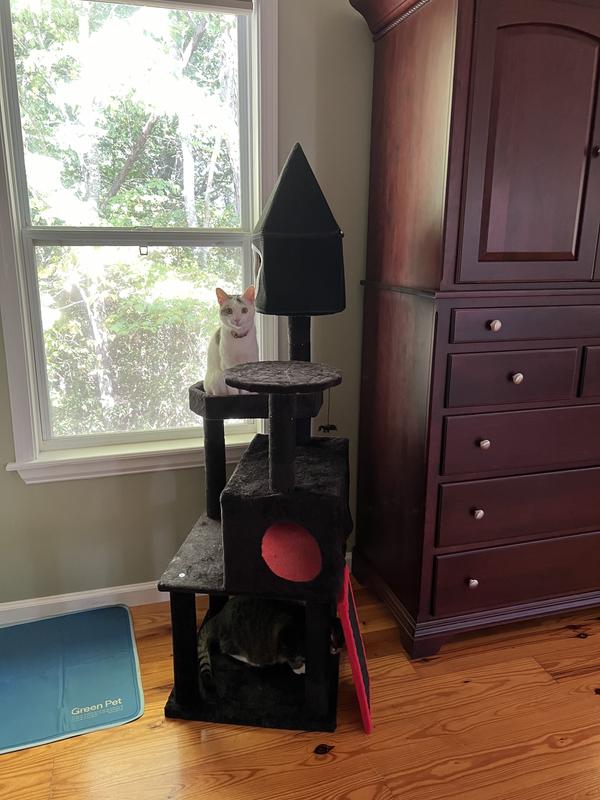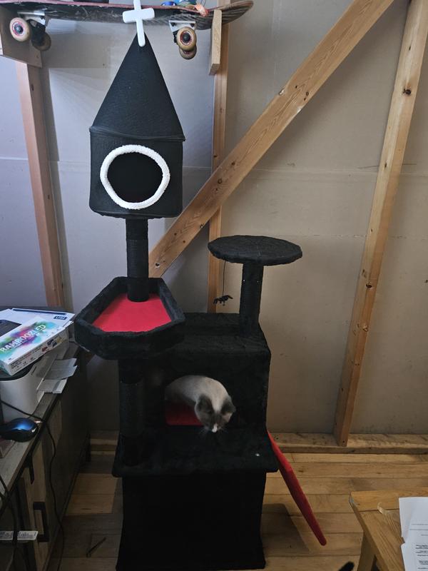 My cats absolutely love this cat tower! I have three cats and two of them spend most of their day just lounging around on this. There are multiple levels with keeps the cats content and feeling separated, there are scratching posts which keeps the kittens claws happy and they have the ability to climb high which keeps my old man happy as he loves looking down at things. The onrle cat prefers the higher up bed which the other likes to attack their tails while they relax. The final cat likes laying inside the one house as it makes him feel secure. I love the gothic look as well! The hanging toys such as the spider is well played with by the kitten. It only took us about 10 minutes to put together and was worth it as my babies adore it! It seems durable and well made and is easy to scrub if needed; my old man put this to the test by puking on it on day two of use! Haha