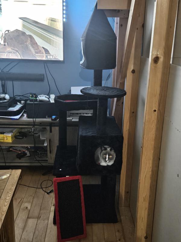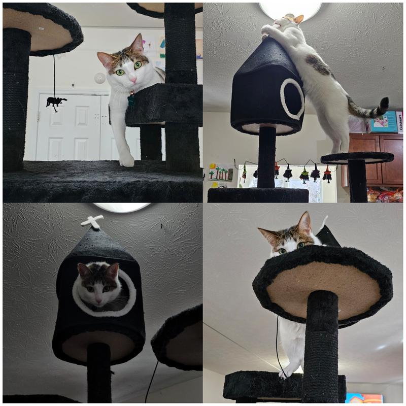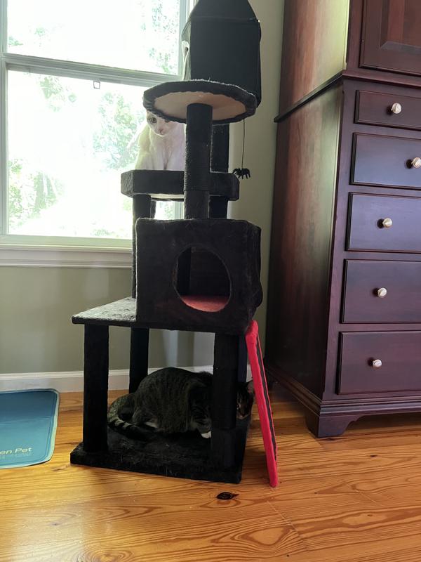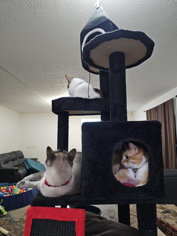 This tower is cute but plagued with quality issues like most cat towers. It is not worth nearly $100. Things hot glued together, hard board uncomfortable surfaces,