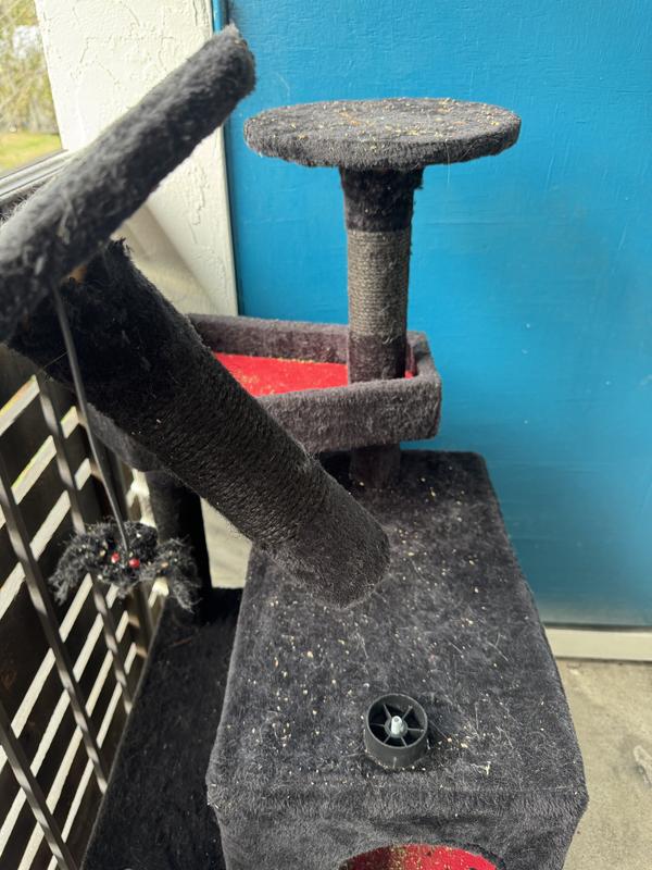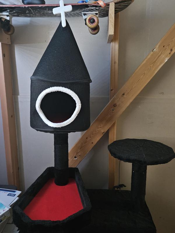 This tower is cute but plagued with quality issues like most cat towers. It is not worth nearly $100. Things hot glued together, hard board uncomfortable surfaces, and for some reason there is a bar stuck straight through the cute coffin box, which my cat loafed in before it was put together and ignores since. But I could ignore most of the quality or design issues since most cat towers on the market are like this, and it's cute and at least kind of feels sturdy probably if you are less than 15 lbs. One thing that really annoyed me though is the little tower has a zipper that's meant to attach the top to the hideaway. The zipper broke immediately during assembly due to flimsy thin metal and was impossible to finish zipping. I've already assembled the rest of the tower at this point, which took about an hour, and I'm not interested in spending another hour deconstructing it, repackaging it and going out of my way to go to a store to return it when it would be easier to get a replacement part. Most companies couldn't care less about the customer experience and will tell you so but chewy is usually really good. I figured I'd ask but they told me no, I'd have to break it down ship it back and they'd be so gracious to send me a replacement for free. I guess I have a hatless tree now, don't buy imo and be careful buying anything that is a hassle to return from chewy because their customer service and/or policies aren't what they used to be apparently