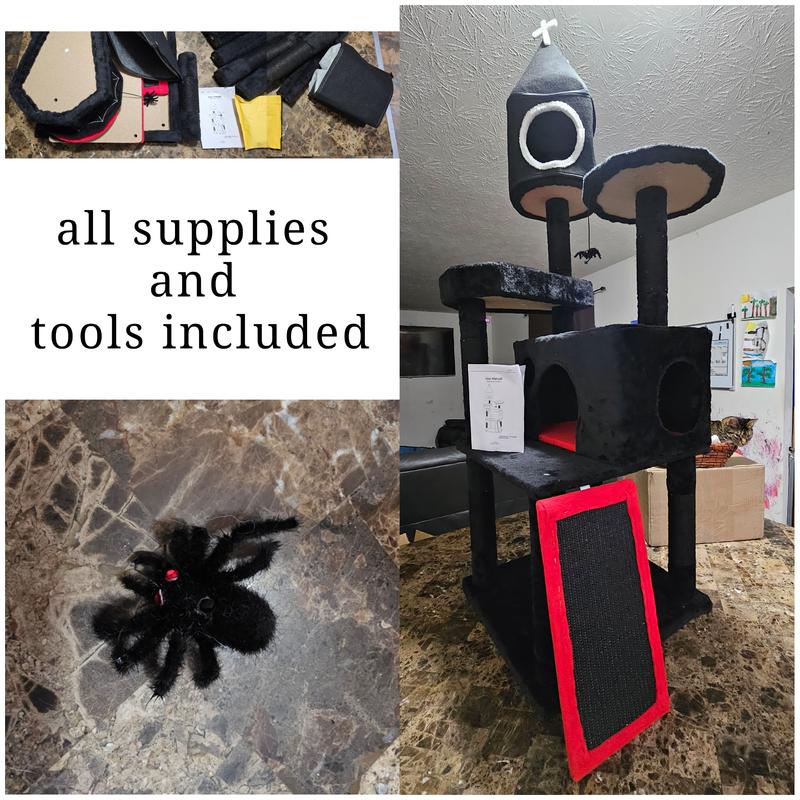 Took about 10 to 15 minutes to put together. Cats immediately jumped on and started to dig nails into roped posts. We have five cats, and each one likes to hang out on this Gothic tower. Only one cat will go in the church, she is very religious. This same cat also thought the fake spider was delicious, so it was removed for their safety. The cat fur has changed the color from black to white and grey. They all enjoy napping in the coffin. Our Tuxedo cat likes to hang out in the dark hide box to get in touch with his dark side.