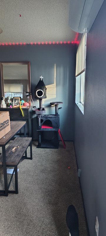 This product is cute and my three cats play and sleep in/on it. I added this cat tree to my bedroom hoping the cats might stay off of my bed and give me some legroom. I didn’t give it 5 stars because of the assembly instructions and I feel that the cover for the cat cave is a little thin and some elastic would have made it easier to put on. Overall a good product and very cute. My cats love the hanging spider.