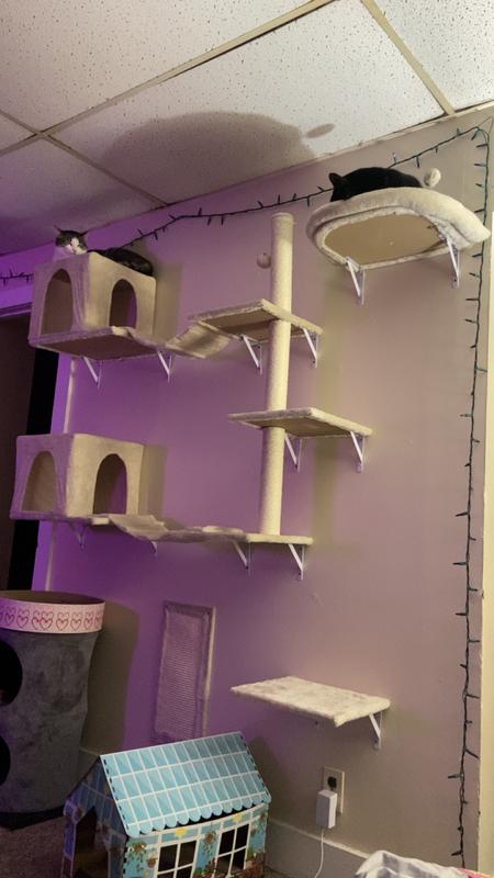 The modular design of this cat shelf set lets you arrange it to suit your space and your kitty’s unique needs and preferences. Try putting one cat condo next to a bridge and a shelf for easy access or pair it with the cat tree to create an exciting combination of activities. You can even put the two cat condos side by side to create a larger enclosed space for your cat. Experiment with placement before mounting and see what works best!