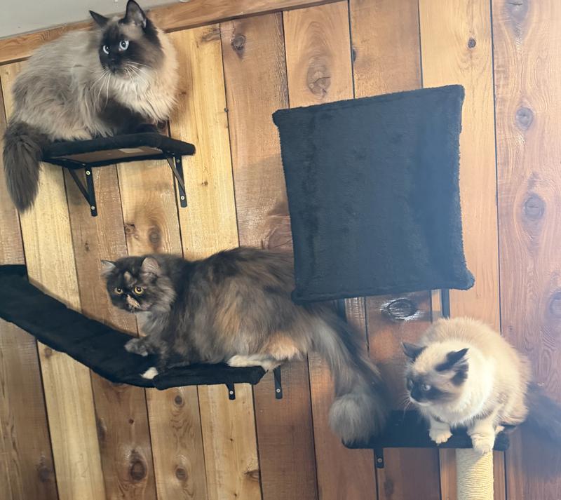 The modular design of this cat shelf set lets you arrange it to suit your space and your kitty’s unique needs and preferences. Try putting one cat condo next to a bridge and a shelf for easy access or pair it with the cat tree to create an exciting combination of activities. You can even put the two cat condos side by side to create a larger enclosed space for your cat. Experiment with placement before mounting and see what works best!