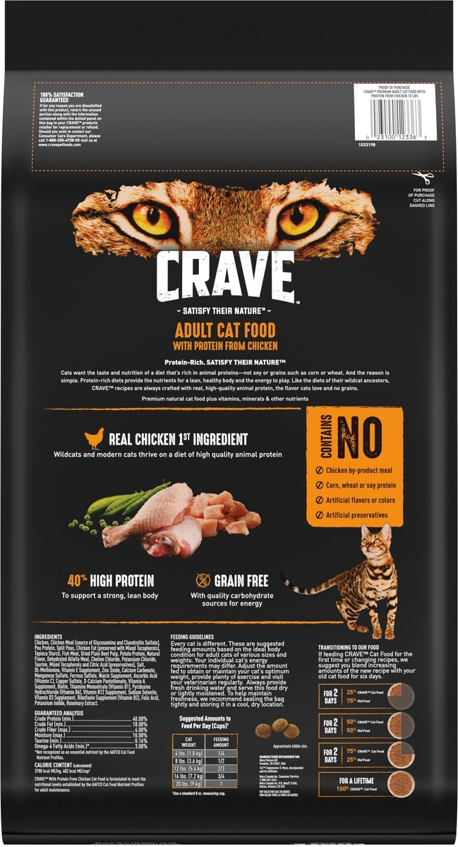 - Crave with Protein from Chicken & Salmon Indoor Adult Grain-Free Dry Cat Food, 10-lb bag$37.98 Chewy Price$36.08 Autoship PricePromo, New Customers Only: Spend $49+, Get $20 eGift Card