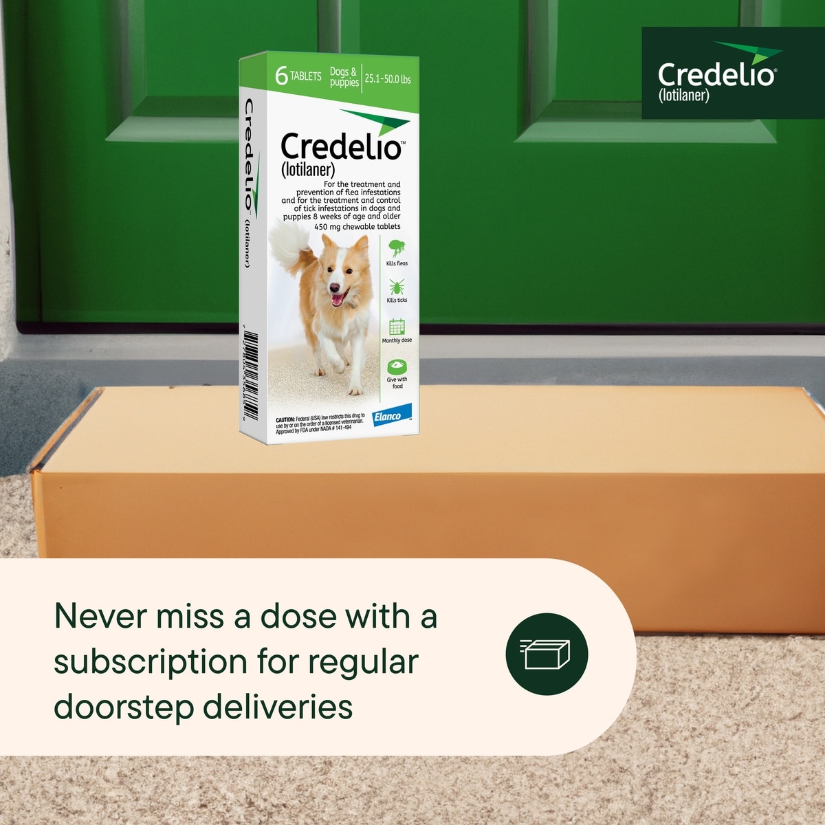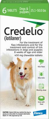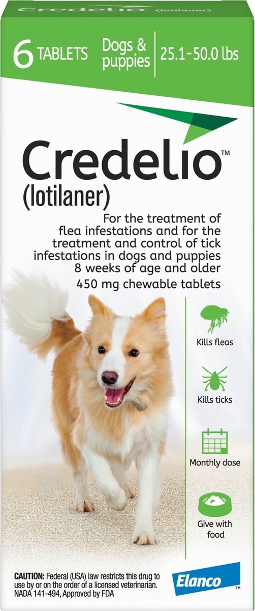 Credelio Chewable Tablet for Dogs, 25.1-50 lbs, (Green Box), 6 Chewable Tablets (6-mos. supply)